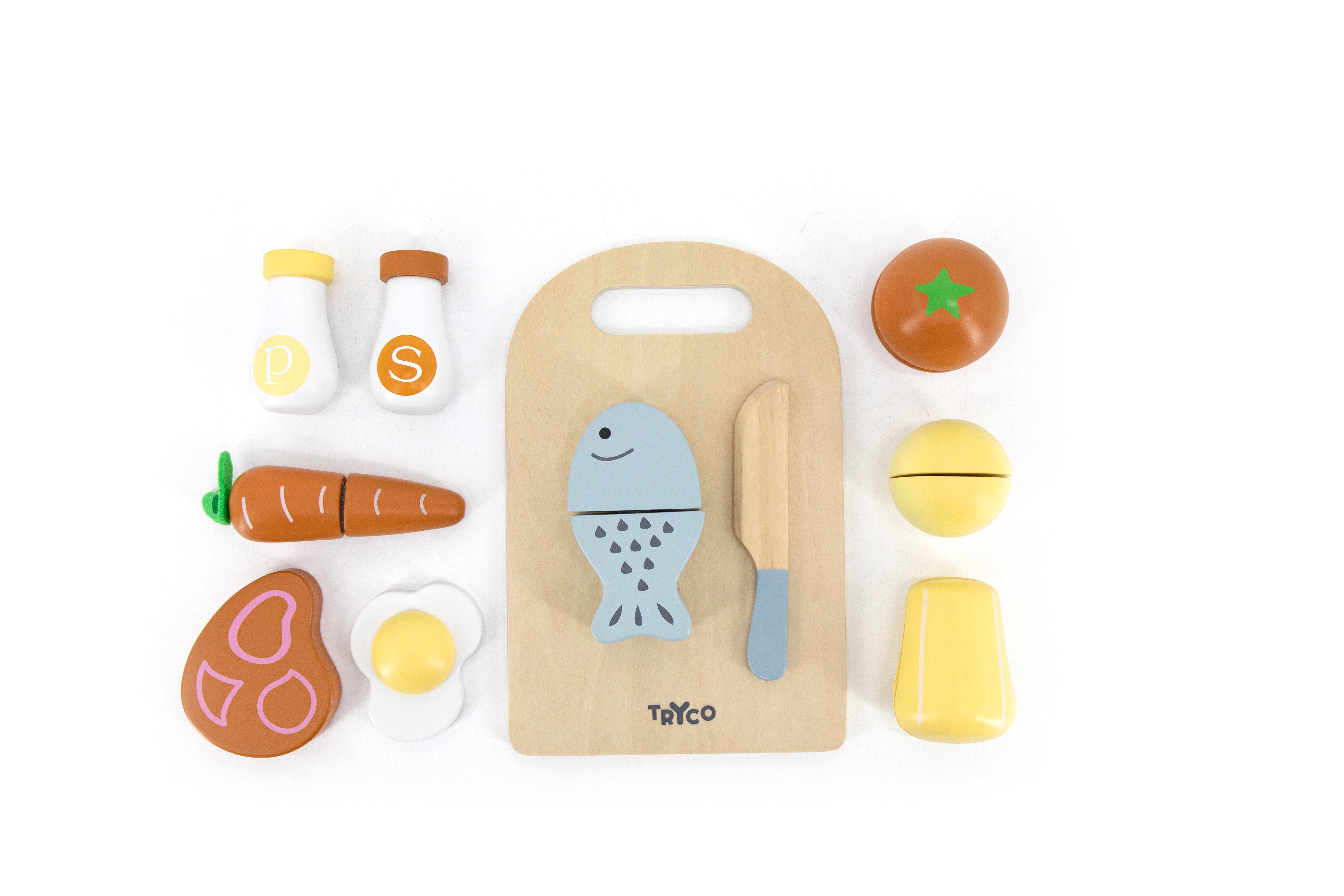 まな板、ナイフ、塩コショウ、目玉焼き、トマト、キノコ、ニンジン、肉や魚などたくさんのアイテムがセットになっています。